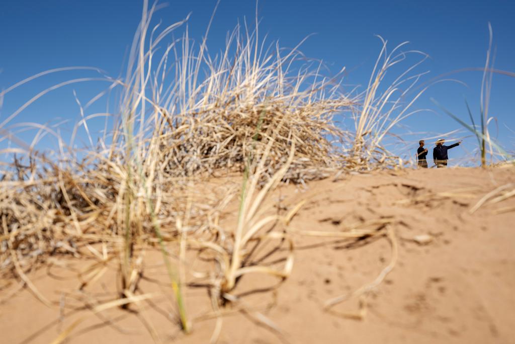 4月10日,在古浪县八步沙林场麻黄塘沙区,八步沙第二代治沙人郭万刚(右)和郭玺一起讨论治沙方案。