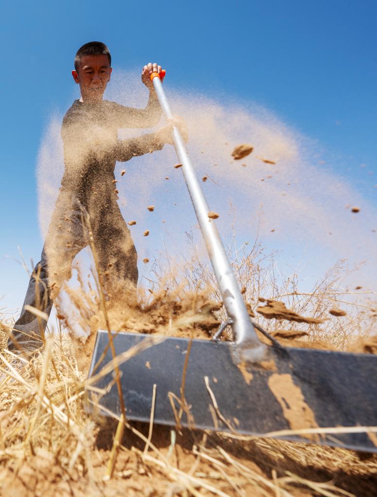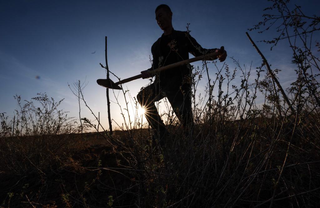 4月10日,在古浪县八步沙林场眼窝子沙治沙点,郭玺在平整树坑。