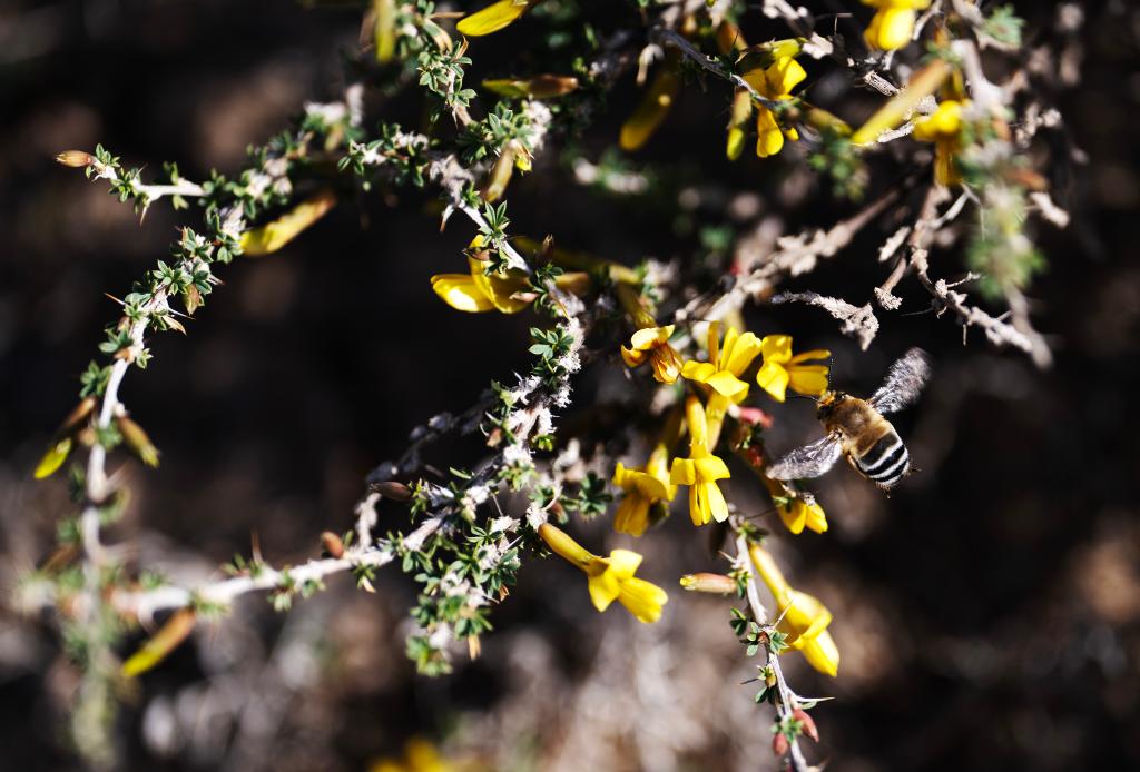 4月11日,在古浪县八步沙林场眼窝子沙治沙点,一只蜜蜂在采蜜。