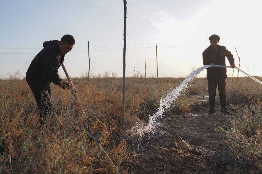 4月11日,在古浪县八步沙林场眼窝子沙治沙点,郭玺(左)和同伴给树苗浇水。