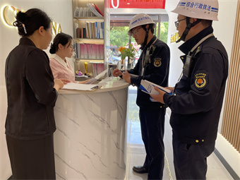 在沿街店铺,执法队员向商铺经营者派发《条例》宣传知识手册的同时,也对商铺开展了巡查执法。针对商铺出现的问题,执法队员指导商户现场处置,耐心引导商户自觉规范做好市容环卫责任区日常管理。