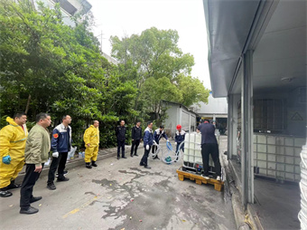 苏州艾克夫电子有限公司紧急应变小组为此次演练主要行动人员,元和街道综合行政执法局负责监督指导。演练在紧张有序的氛围中展开,仓库管理员在巡检危废仓库时,突然发现废液存放区域地面有少量废切削液泄漏。他立即电话通知副总指挥,副总指挥迅速赶赴现场查看情况。经确认,泄漏原因系装有废切削液的吨桶桶壁开裂。副总指挥随即上报公司主要负责人,负责人当机立断,决定启动应急预案。随着指令的下达,紧急应变小组迅速集结,按照预案要求展开行动。小组成员们身着防护服,佩戴防护面具和手套,使用专用工具对泄漏物进行清理,同时启动应急泵将废液转移至安全区域。
