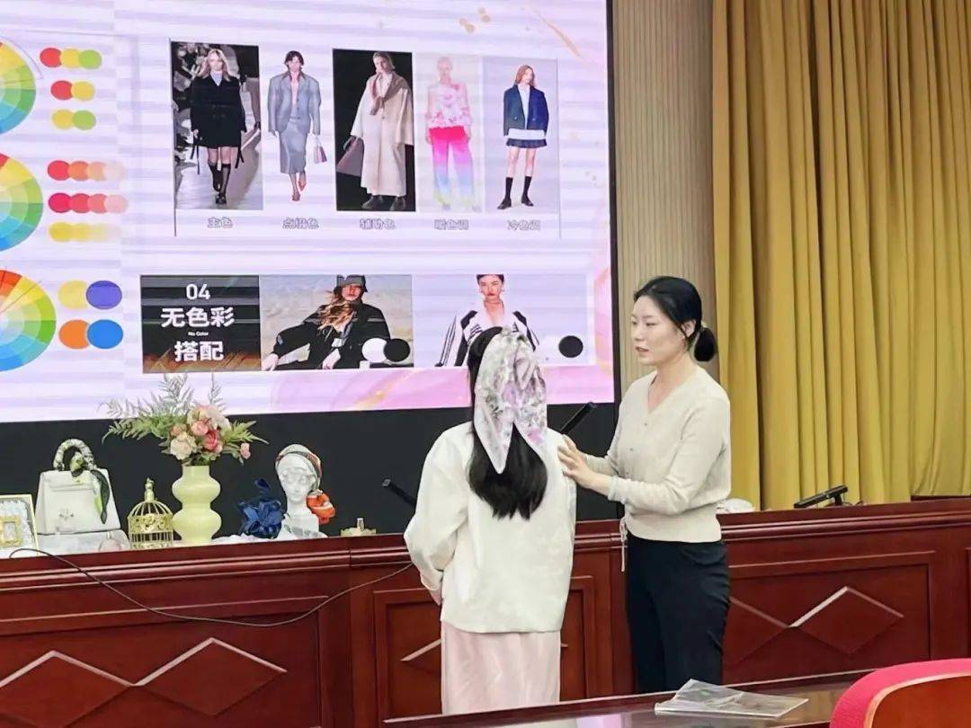 专业老师为女职工们详细讲解了丝巾的作用。各种丝巾系法、搭配技巧在老师演示中一一呈现。对折、打结、整理,每个人根据自己的喜好,将手中的丝巾变幻出不同的系法。同时,化妆师还邀请现场女职工们作为化妆模特,从模特的皮肤、脸型、眉型等方面给大家讲解职场妆容的步骤和方法。