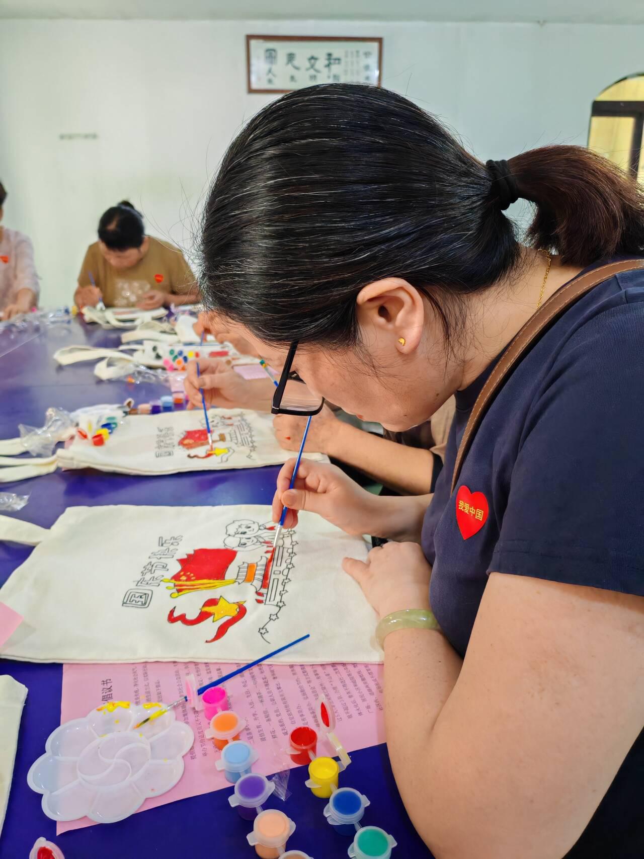 为庆祝金秋国庆,弘扬中华优秀传统文化,发扬爱国精神,回顾和传承历史,展望美好未来。增强社区居民的爱国情怀和凝聚力,9月25日,竹园社区在棕榈湾小区组织居民开展“庆国庆 欢乐绘”---绘画包包活动。此次活动旨在通过手绘的方式,让居民们亲手制作具有庆国庆特色的包包,以此表达对祖国的热爱和祝福。