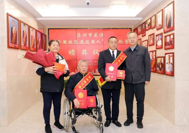 在苏州市退役军人事务局机关,举行苏州市获评“全国模范退役军人”荣誉称号颁奖仪式。在热烈而温馨的氛围中,徐卫为张凯、展亚平两位获奖者颁发荣誉证书及奖章,勉励他们珍惜荣誉、再接再厉,充分发挥模范带头作用,引领广大退役军人积极投身经济社会建设,退役不褪色,建功新时代。
