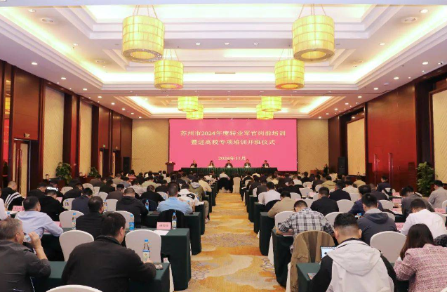 11月4日,苏州市2024年度转业军官岗前培训暨进高校专项培训正式开班。今年全市共接收安置126名计划分配转业军官,其中100名参加本次培训,其余参加行业专项培训。苏州市退役军人事务局局长王俊出席开班仪式并作动员讲话。