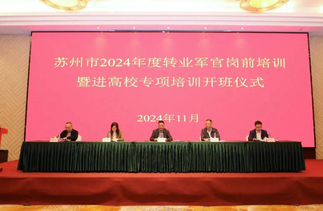 开班仪式上,苏州市退役军人事务局移交安置处通报了苏州市2024年度退役军人移交安置工作完成情况;市退役军人教育培训指导中心、苏州大学退役军人事务培训学院分别介绍了岗前培训和进高校专项培训的时间安排、课程设置和各项规章制度;市委组织部有关负责同志宣读了临时党支部和班委会成员名单;两位转业军官代表作了交流发言。