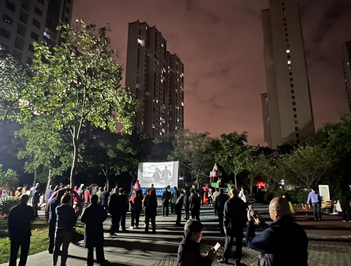 随着夜幕的降临,幕布电影的工作人员在社区工作人员的协助下,迅速高效地完成了幕布与放映设备的搭建。居民们随后陆续抵达,他们或结伴而行,或带着家人孩子,唯一相同的就是脸上都洋溢着期盼与欢愉。观众们井然有序地站立于幕布前,全神贯注地沉浸在影片的情节之中。影片放映结束后,居民们纷纷赞叹,这样的活动不仅让他们重温了经典之作,更让他们深切感受到了社区的温情与关怀。许多老年人更是感慨万千,认为这样的时光仿佛让他们重返青春岁月,再次沉浸在久违的集体观影乐趣之中。