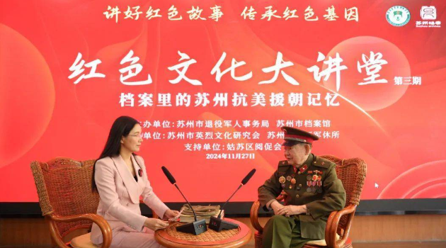 11月27日下午,“红色文化大讲堂”第三讲活动“档案里的苏州抗美援朝记忆”在苏州市军队离休退休干部胥江休养所举行。本次活动由苏州市退役军人事务局和市档案馆联合主办,市英烈文化研究会、胥江军休所承办,姑苏区全民阅读促进会协办。苏州市退役军人事务局副局长刘伟、市档案馆副馆长贾莉出席。军休干部代表、市档案馆党员代表、苏州建设交通高等职业技术学校国旗班学生、姑苏区全民阅读促进会成员和部分社区居民参加。