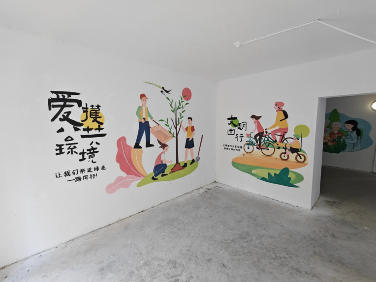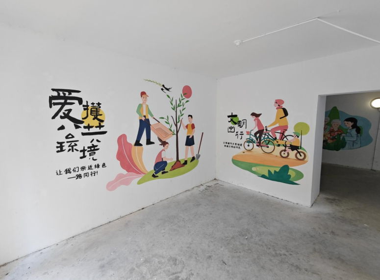 然而,清理后的架空层一度处于闲置状态,未能充分发挥其潜在价值。为此,水韵花都社区充分发挥“党建引领、多方联动、共建共享”的社区治理模式优势,广泛征求居民意见,经过多轮与海棠先锋、物业等协商讨论,最终决定为架空层墙壁进行彩绘。原本冷冷清清、杂乱无序的架空层,在精心改造下,蝶变成了充满文化气息的宣传阵地,给老墙换上了“新皮肤”,在楼道里传播起了新风尚,为社区增添了一道别样的风景线。