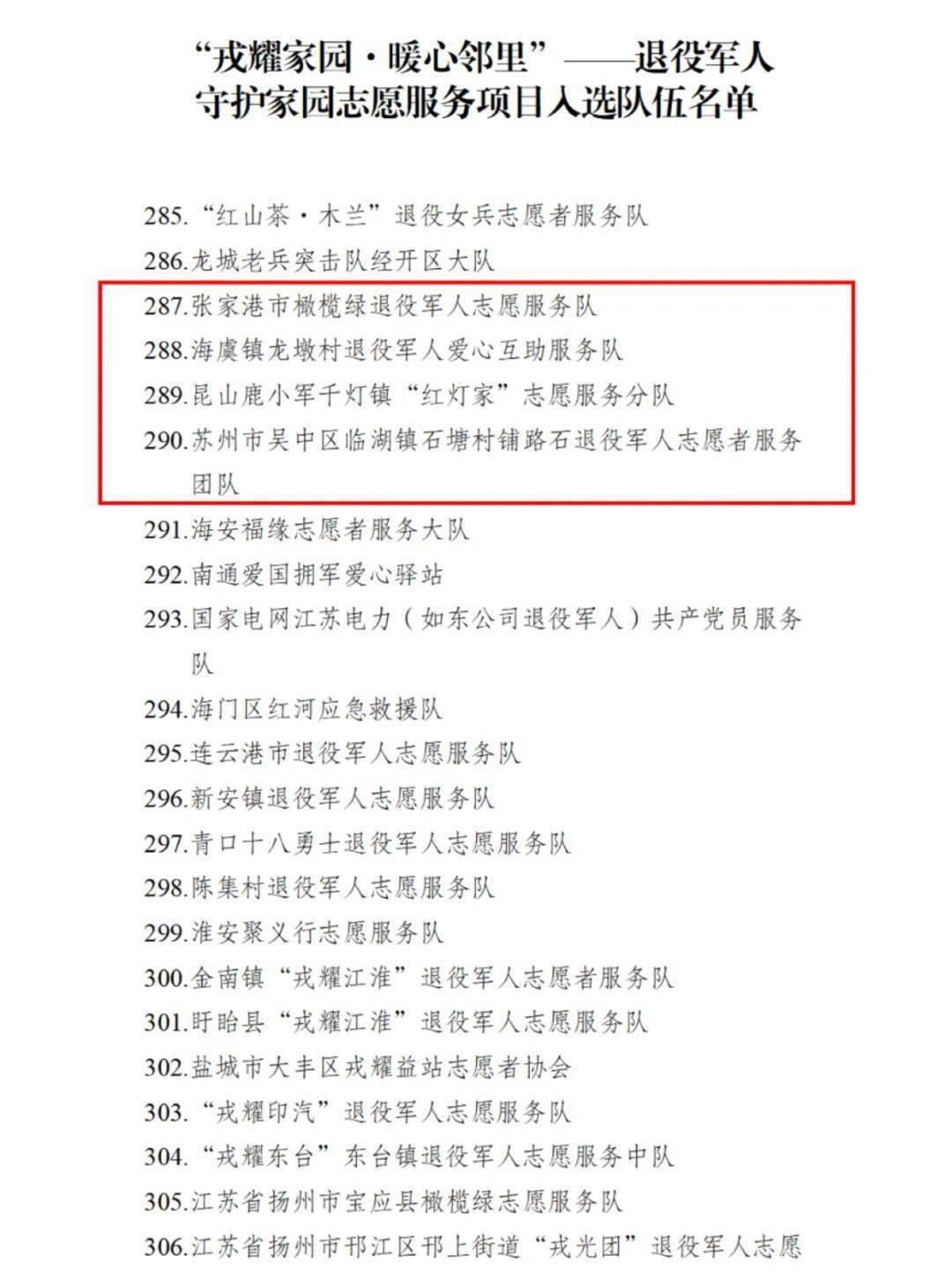 日前,“戎耀家园·暖心邻里”退役军人守护家园志愿服务项目结果公布,本项目在全国遴选出1000支“退役军人守护家园志愿服务队”。其中,张家港市橄榄绿退役军人志愿服务队、常熟市海虞镇龙墩村退役军人爱心互助服务队、昆山鹿小军千灯镇“红灯家”志愿服务分队、吴中区临湖镇石塘村铺路石退役军人志愿者服务团队4支队伍入选。