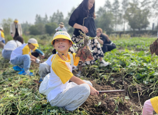 秋天是丰收的季节,孩子们来到农田,了解秋季果实的种类、生长周期及营养价值,并亲手挖红薯,感受劳动的喜悦与大自然的馈赠,启发对生命循环和自然规律的思考。在扎染非遗体验坊,孩子们沉浸式体验传统工艺的魅力,将布料浸入染缸,经过染色、拆解、冲洗,原本单调的白色布料,绽放出独一无二的美丽图案。