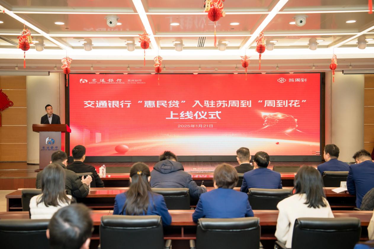 2025年1月21日上午,交通银行“惠民贷”正式入驻苏周到“周到花”平台上线仪式在交通银行苏州分行顺利举行。此次合作标志着交通银行苏州分行与苏州数智科技集团有限公司在金融服务领域的深度合作迈出了关键一步,旨在创新多元化消费场景金融服务,全方位助力提振居民消费。