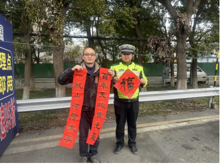一场特别的送春联活动在高速入口处举办,书法爱好者们写下一副副春联,交警们为返家的司机们送上春联和祝福,提醒他们在春运期间注意交通安全,遵守交通规则,确保平安到家。