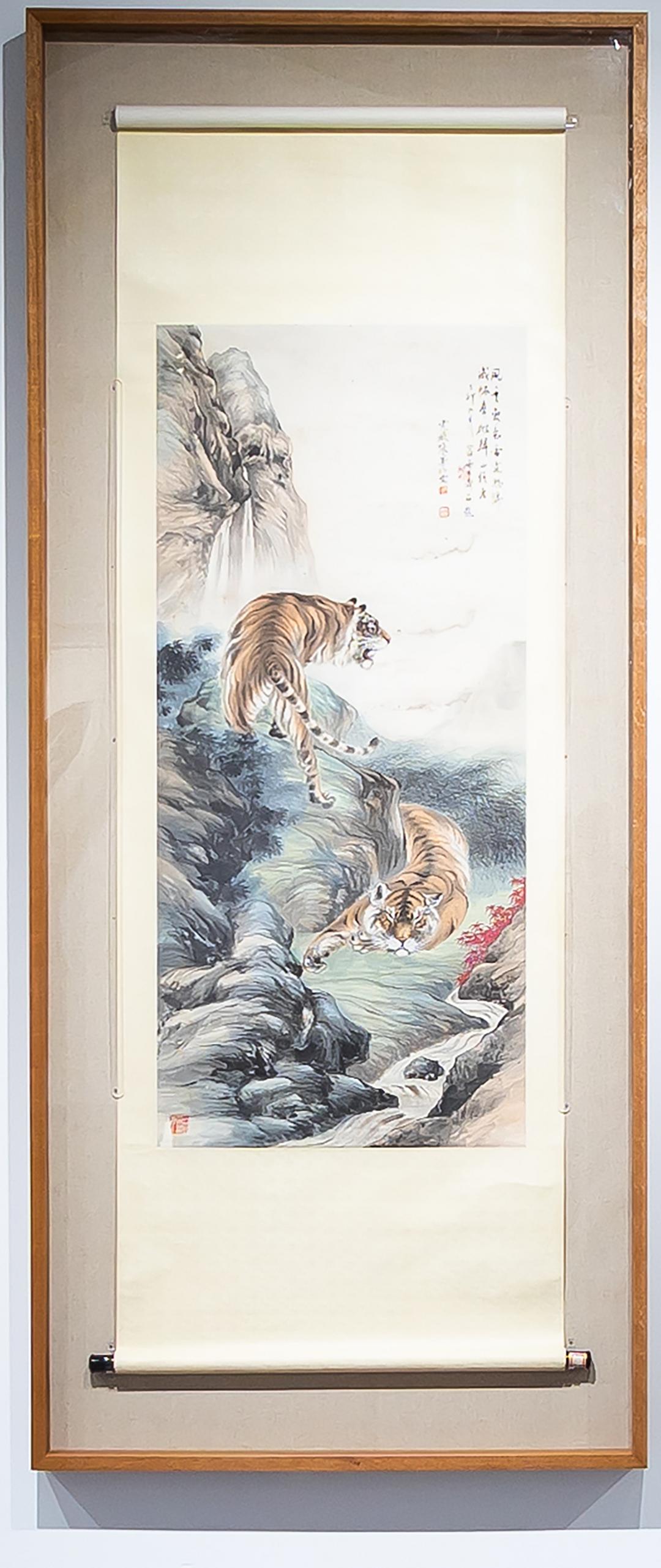 《威振群雄》便是他深入观察与艺术造诣的完美结晶,画中两只猛虎,一立一卧于山冈草丛间,立虎张口怒啸,尾随摆动,似要震彻山谷;卧虎则慵懒静卧,与立虎形成鲜明对比,将老虎的野性与宁静展现得淋漓尽致。
