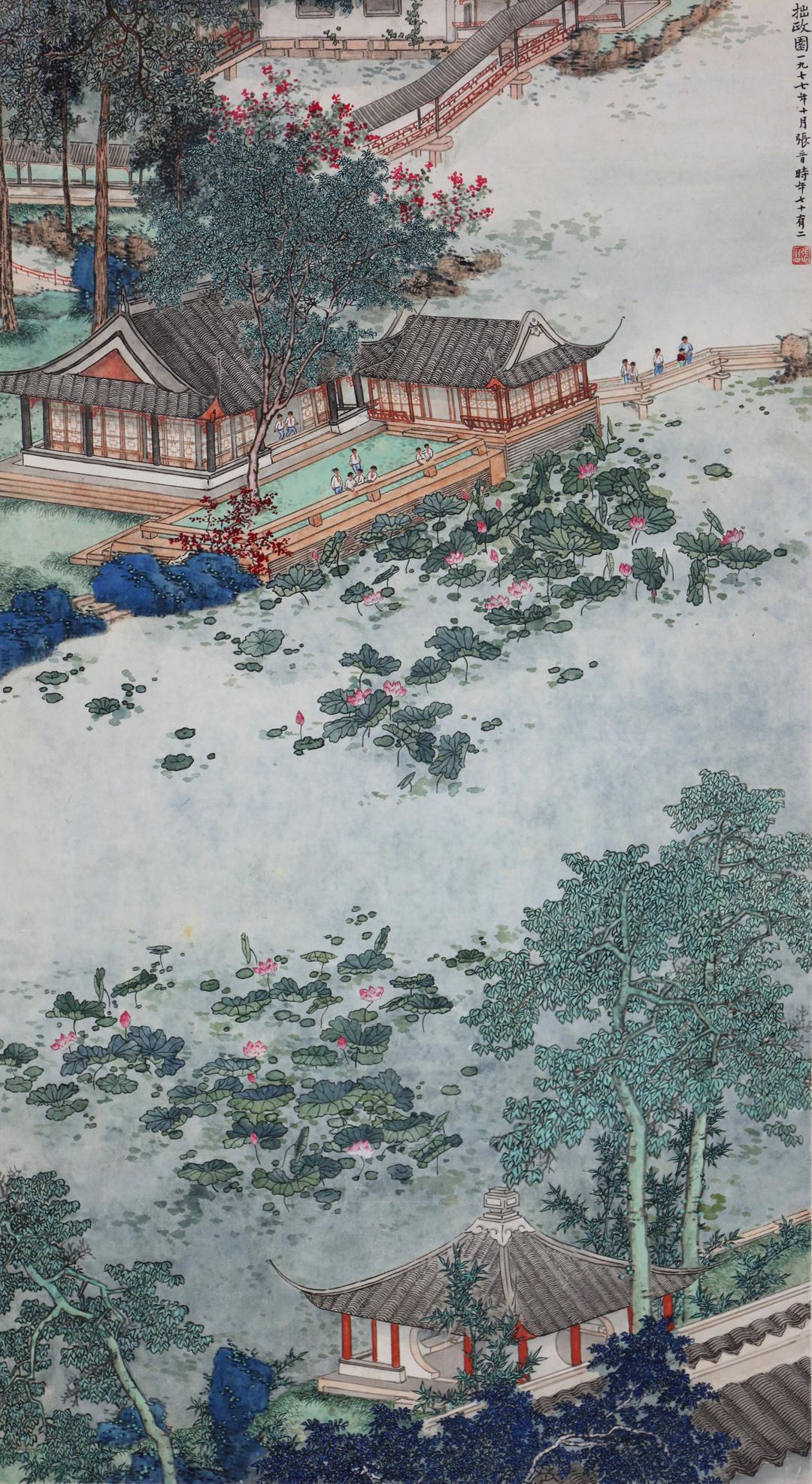 拙政园,苏州古典园林的代表,以其“以水见长”“庭院错落”“花木为胜” 的园林文化闻名于世。张晋以一丝不苟的工笔技法描绘此景,用笔工细劲健,意境清晰。