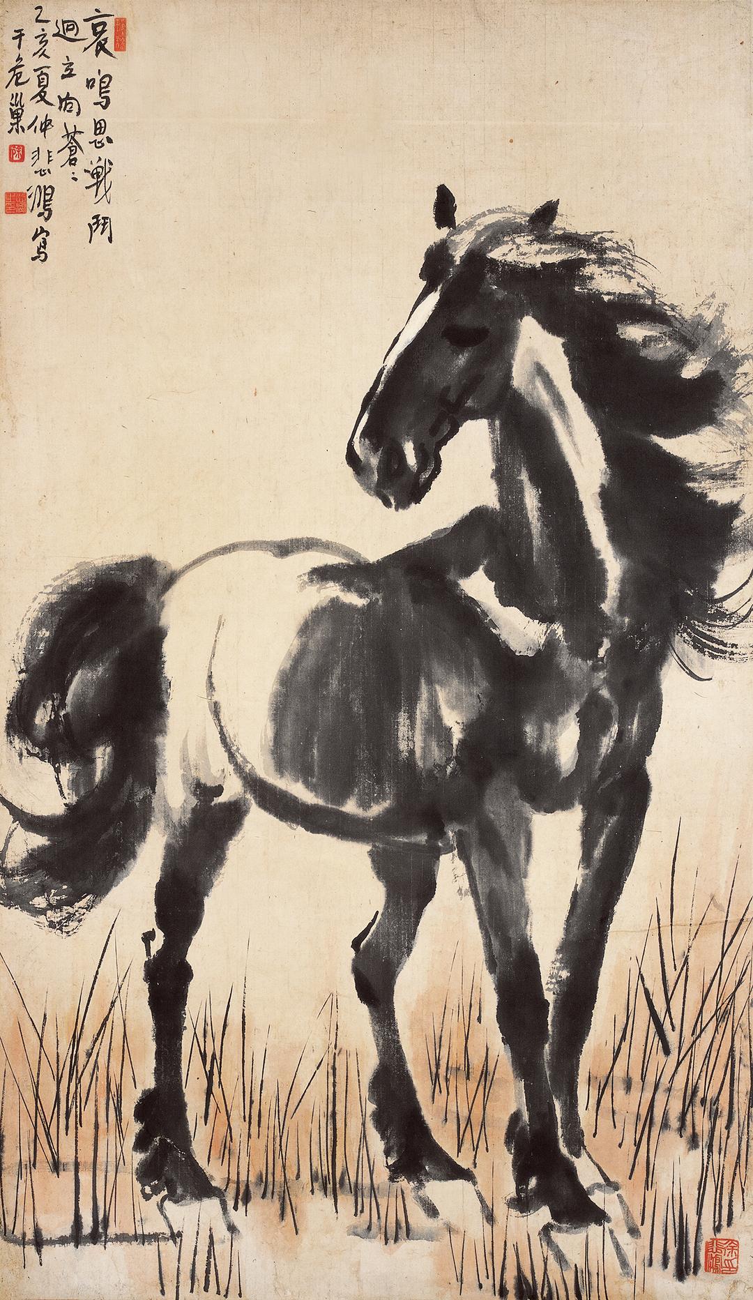 徐悲鸿的《立马图》以其雄浑大气的风格和深刻的思想内涵震撼人心。