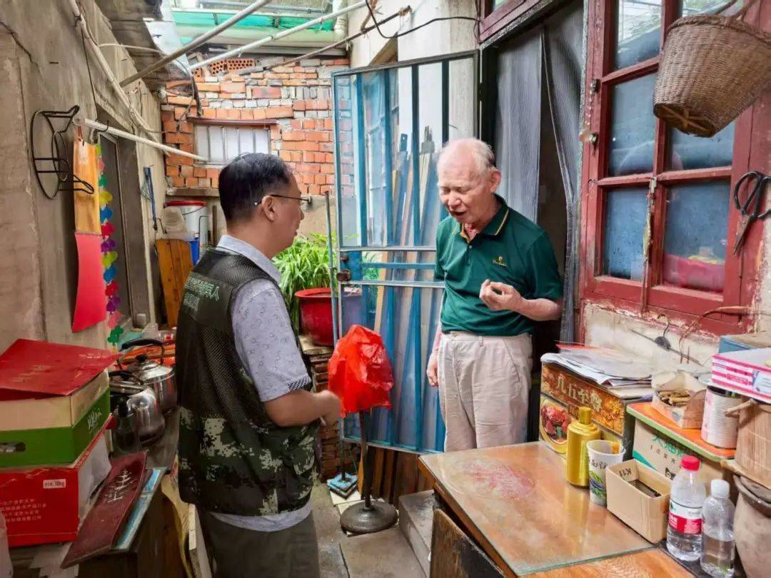 吴江区松陵街道退役军人志愿者在台风来临前走访辖区孤老,叮嘱老人无特殊情况不要外出,有困难及时联系服务站