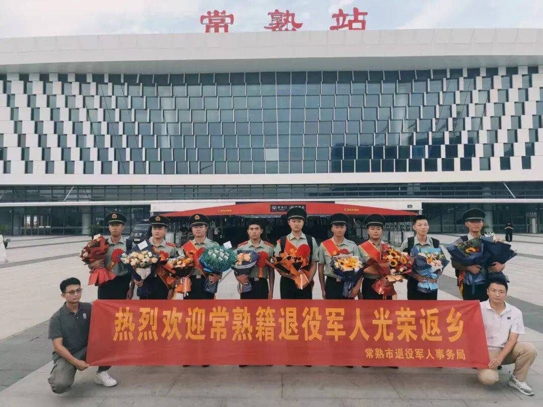 常熟市退役军人事务局、各镇(街道)和村(社区)退役军人服务站的工作人员在各交通枢纽满怀热忱地迎接退役士兵们光荣返乡。 工作人员和志愿者手持标牌,为返乡士兵送上鲜花、披上绶带,退役士兵与朋友、家人深情拥抱,一幕幕温暖场景在常熟站不断上演。