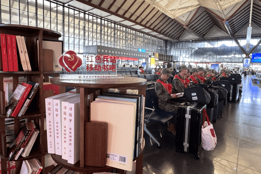 为保障新兵运输高效有序、暖心温馨,苏州军供站在苏州站、苏州北站等重要枢纽设立专门保障点,提供物资发放、医疗服务和多项便民措施,全力营造暖心送兵环境。在苏州北站候车厅,“热血男儿 参军报国”的横幅格外醒目。军供站不仅准备了崇军慰问物品,还设置“红色兵站移动书吧”,提供各类书籍供新兵候车时阅读,体现出新时代军人崇文尚武的精神风貌。