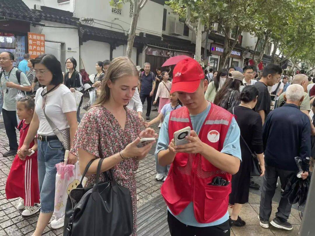 面对节假日持续高温天气,提前配备的防暑用品、应急药品等物资也派上了用场。志愿者主动上前,为被蚊虫叮咬或因高温出现身体不适的游客,涂抹清凉油并提供藿香正气水,及时缓解游客的不适症状。志愿者充分发挥语言优势,架起沟通桥梁,为来自不同国家的外籍游客提供多语种问路指引,帮助他们顺利找到目的地。此外,志愿者还躬身力行,细致清理散落的烟头、纸巾、果皮等杂物,以点滴行动守护景区周边环境,共同绘就文明旅游的靓丽风景线。