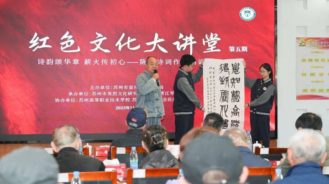 11月14日下午,由苏州市退役军人事务局主办的第五期“红色文化大讲堂”在胥江军休所举行。活动以“诗韵颂华章 薪火传初心——陈毅同志诗歌赏读”为主题,通过诗歌朗诵、歌曲演唱、感悟分享、书画创作展示等多元艺术形式,带领观众重温革命岁月、感悟红色精神,搭建起红色文化传播的桥梁,增强了党员干部与广大群众的历史使命感和文化认同。本次活动由市英烈文化研究会、胥江军休所承办,苏州高等职业技术学校、姑苏区全民阅读促进会协办。