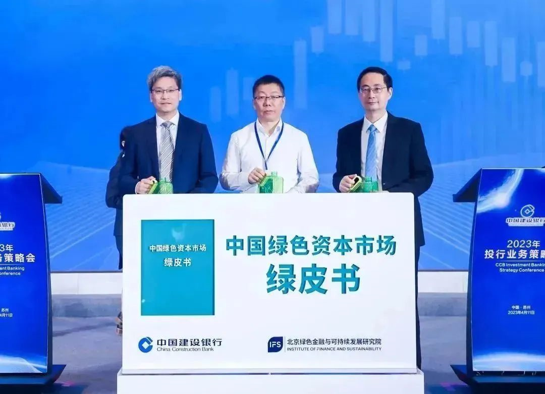 ▲建设银行副行长崔勇、北京绿金院院长马骏、国家绿色发展基金公司总经理张荣庆共同发布《中国绿色资本市场绿皮书》