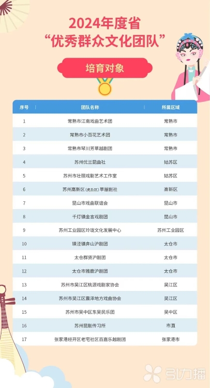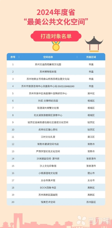 近日,江苏省文化和旅游厅公布《2024年度“双千计划”实施名单》,苏州20家特色空间入选2024年度省“最美公共文化空间”打造对象、17支群文团队入选2024年度省“优秀群众文化团队”培育对象,入选数量均居全省前列。截至目前,苏州已有77家省“最美公共文化空间”、79支省“优秀群众文化团队”。
