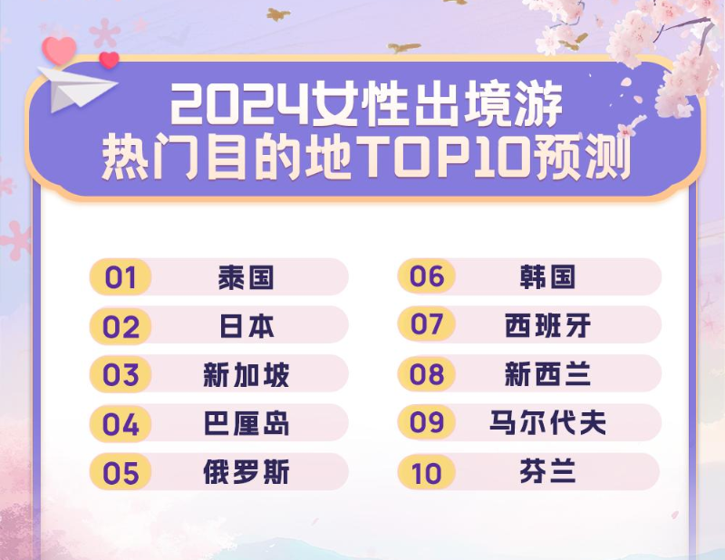 报告基于同程旅行平台大数据,分析预测了2024年度女性消费者的旅行趋势。在出游目的地选择方面,2024年女性消费者不仅追“网红”城市,也爱历史文化名城,对于挖掘小众目的地也很感兴趣。2024年女性的出境游意愿略高于男性,泰国、日本、新加坡、巴厘岛等将是关注度较高的出境游目的地。