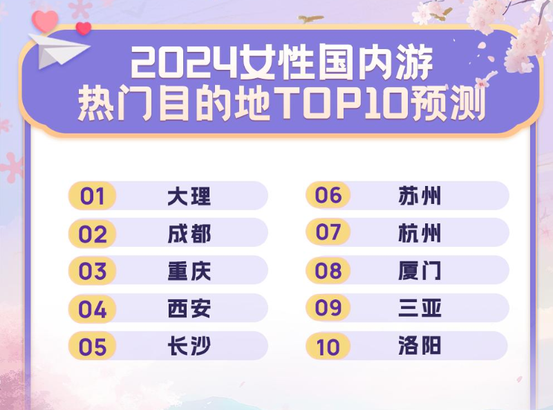 平台相关数据显示,在旅游消费持续火热的当下,广大女性旅游爱好者的消费偏好越来越多元化。对于喜欢热闹与潮流的“95后”及“00后”女性而言,“网红”目的地依然是“打卡”首选。《报告》预测,今年比较受女性青睐的国内长线游目的地主要有大理、成都、重庆、西安、长沙、苏州、杭州、厦门、三亚、洛阳等。