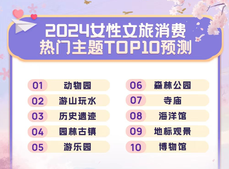 同程文旅消费大数据分析预测显示,2024年度女性消费者文旅消费热点将主要集中于动物园、游山玩水、历史遗迹、园林古镇、游乐园等十个主题,与往年同期基本一致。分年龄看,“80后”“90后”女性的文旅消费偏好更多集中于适合亲子及家庭出游的主题景区,例如动物园、游乐园等,而“00后”女性的文旅消费则相对更集中于适合独自玩乐或适合闺蜜游及情侣一起出游的主题上,例如寺庙祈福类、演出赛事及其他一些休闲碎片化产品。