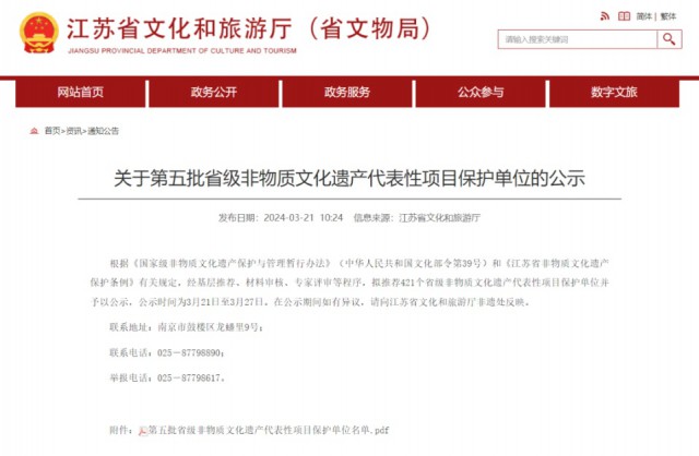 近日,江苏省文化和旅游厅公示了第五批省级非物质文化遗产代表性项目保护单位名单。