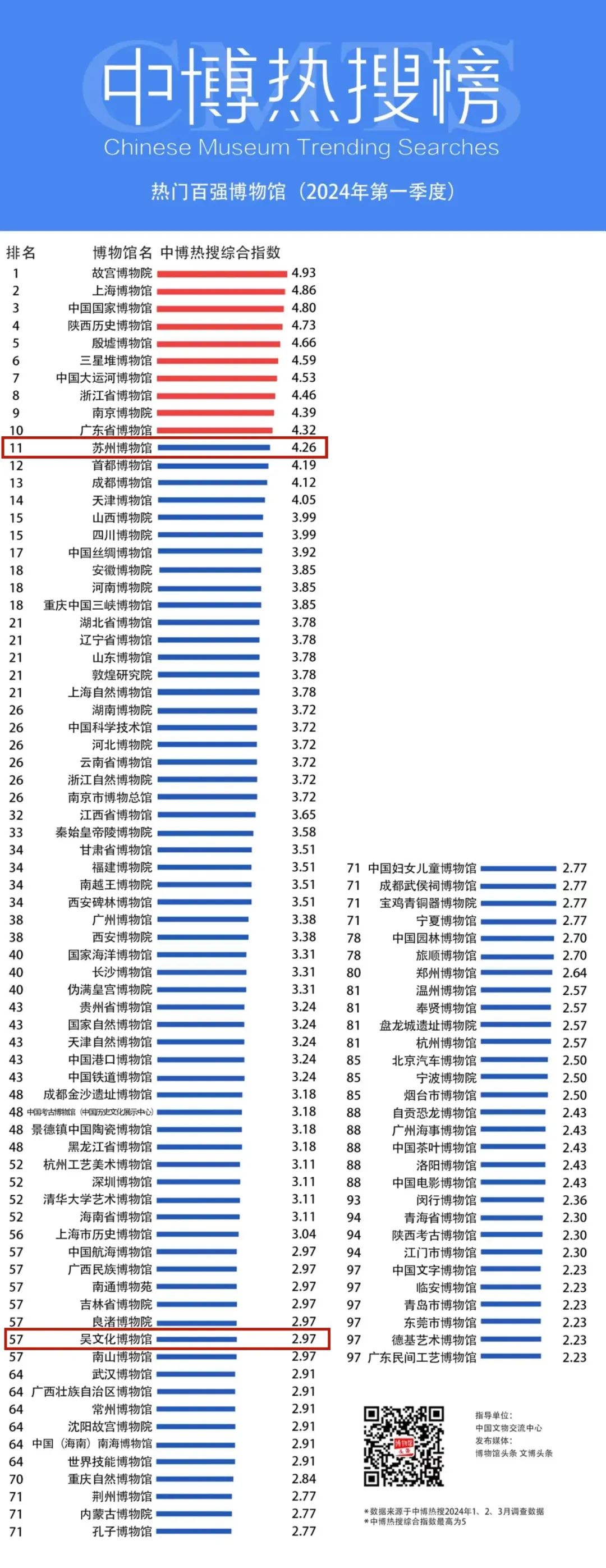 昨天(4月7日),由中国文物交流中心指导、博物馆头条统计发布的“中博热搜榜”发布了 2024年第一季度全国热门百强博物馆榜单。