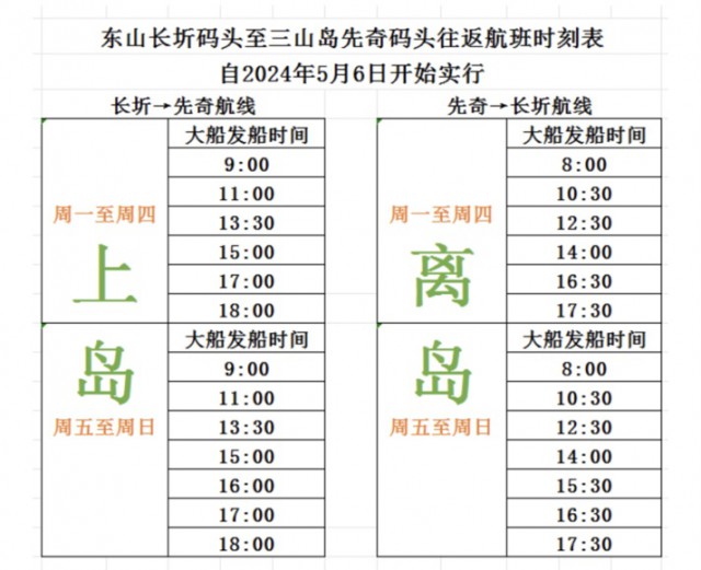 ●活动规则:2024届全国应届高考生凭本人准考证,可至长圻码头免费乘坐班船(时刻表如下)至三山岛景区游玩。仅限于高考毕业生本人,若无法出示有效证件,需按照门市价执行。