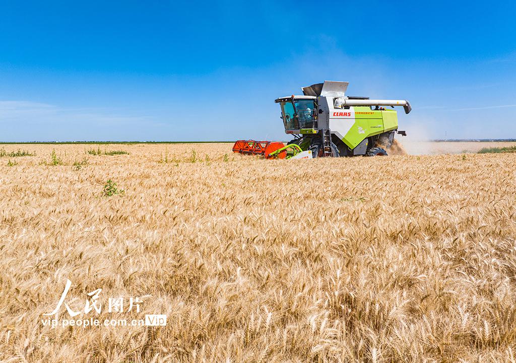 2025年6月29日,新疆昌吉回族自治州呼图壁县二十里店镇小土古里村,联合收割机在收割小麦。何龙摄(人民图片网)...
