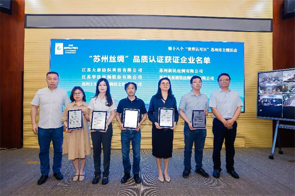 苏州丝绸同样是“苏州制造”的特色名片。为了推进苏州丝绸产业振兴,加快实施质量品牌提升工程,苏州在全国首创开展“苏州丝绸”品质认证工作,有效提升了传统丝绸企业的质量管理能力和产品质量水平。活动中,江苏大唐纺织科技有限公司等一批代表企业获得“苏州丝绸”品质认证证书,进一步擦亮了品牌。