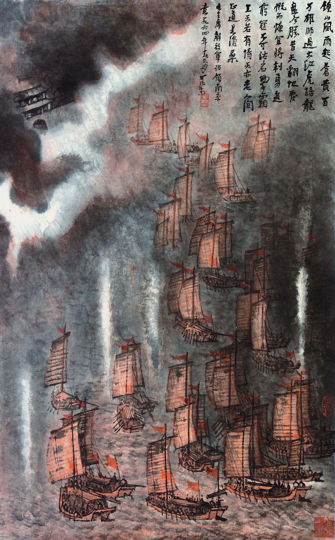 作品采用俯瞰视角,通过精心布局,将硝烟弥漫中千帆竞发、万众一心解放南京的壮阔场景生动地呈现在画布之上。左侧摇摇欲坠的城楼象征着旧政权的衰败,而画面整体的墨色浓重、构图饱满,则体现了新时代的蓬勃生机与力量。