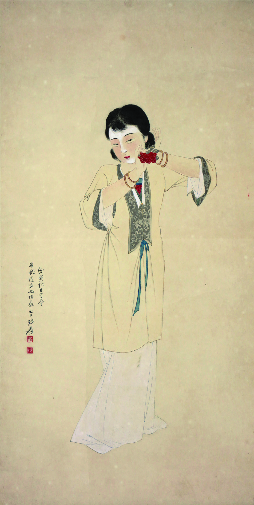 画中仕女身着华丽服饰,一手抚鬓,一手簪花,姿态曼妙优雅。