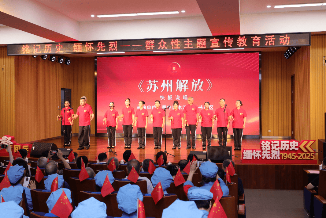 上午9时,活动在全场挥动国旗的热烈氛围中拉开帷幕。藏书社区文艺队以快板说唱《苏州解放》点燃现场气氛。市“青苗”青年讲师团成员沈燕以《老前辈的“不弯腰”,我们的“接着跑”》为题,从抗战年代的脊梁精神,讲到当代青年的使命传承。市退役军人事务局红星艺术团与市军休干部服务管理中心的40位表演者带来大合唱《长征组歌·大会师》。激昂的旋律、嘹亮的歌声,唱出了红军长征胜利的豪迈,也展现了退役军人不忘初心、永葆本色的精神风貌。