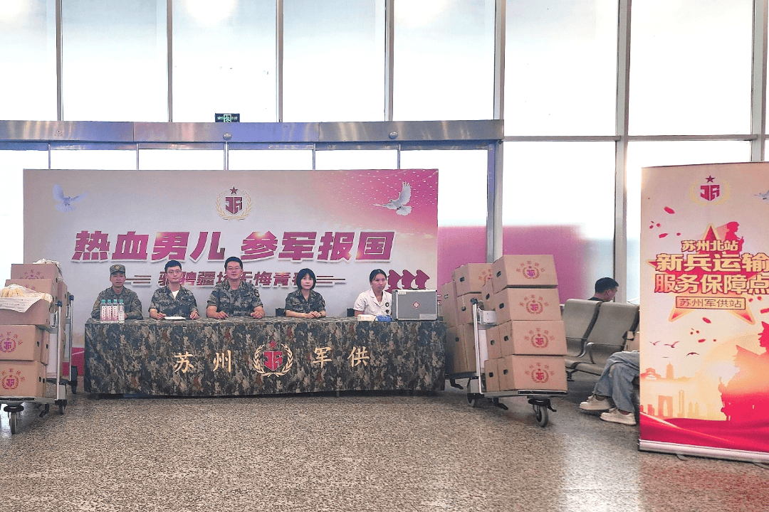 为保障新兵运输高效有序、暖心温馨,苏州军供站在苏州站、苏州北站等重要枢纽设立专门保障点,提供物资发放、医疗服务和多项便民措施,全力营造暖心送兵环境。在苏州北站候车厅,“热血男儿 参军报国”的横幅格外醒目。军供站不仅准备了崇军慰问物品,还设置“红色兵站移动书吧”,提供各类书籍供新兵候车时阅读,体现出新时代军人崇文尚武的精神风貌。