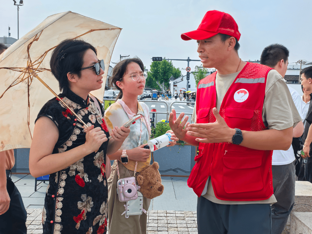 面对节假日持续高温天气,提前配备的防暑用品、应急药品等物资也派上了用场。志愿者主动上前,为被蚊虫叮咬或因高温出现身体不适的游客,涂抹清凉油并提供藿香正气水,及时缓解游客的不适症状。志愿者充分发挥语言优势,架起沟通桥梁,为来自不同国家的外籍游客提供多语种问路指引,帮助他们顺利找到目的地。此外,志愿者还躬身力行,细致清理散落的烟头、纸巾、果皮等杂物,以点滴行动守护景区周边环境,共同绘就文明旅游的靓丽风景线。