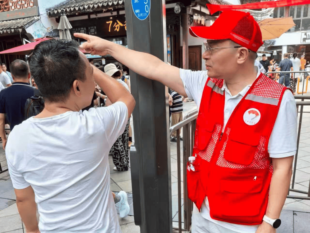 节日期间,苏州各个景点迎来旅游热潮,其中苏州博物馆、拙政园、狮子林等景点尤为火爆,游人如织、热闹非凡。熙熙攘攘的人群中,身着醒目红色志愿服务马甲的退役军人志愿者格外引人注目,他们精神抖擞地穿梭于景点之间,俯身倾听、耐心答疑,为游客指引路线、维持秩序、解答咨询,同时还关注特殊群体的需求,主动搀扶引导乘坐轮椅、推婴儿车或行动不便的游客,这些无微不至的帮助,为游客的顺畅出行提供坚实保障。10月1日至7日,志愿者们轮流排班、风雨无阻、坚守岗位,无论是烈日炎炎还是阴雨绵绵,始终以专业的服务水准和温暖的待客之道,为来自五湖四海的游客提供了优质、贴心的志愿服务。