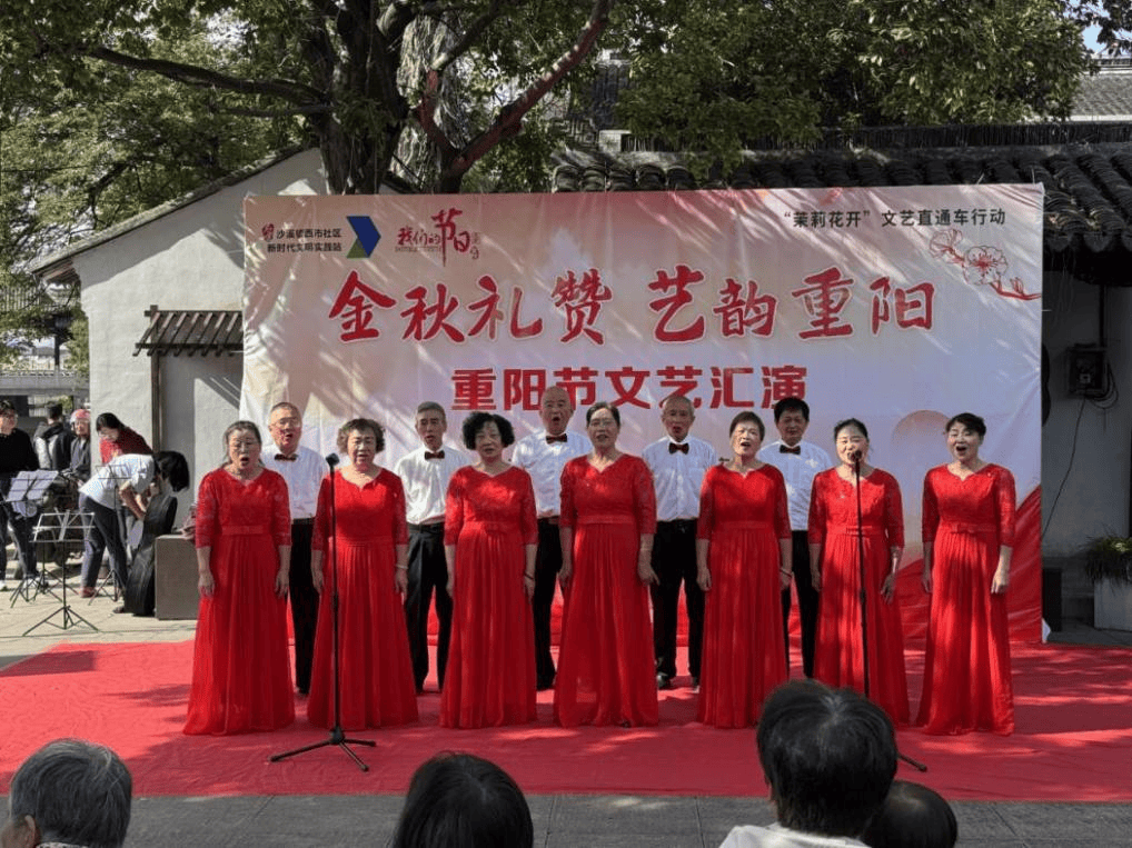 重阳节来临之际,太仓市沙溪镇举办“金秋礼赞,艺韵重阳”文艺汇演,活动现场张灯结彩,氛围喜庆。趣味游戏区的套圈、投壶等传统项目吸引众多老人参与,退役军人志愿者全程提供帮助,或指导游戏规则,或搀扶行动不便的长者,维持现场秩序。文艺汇演中,老兵与合唱队成员身着盛装,先后演唱《祝福祖国》《珊瑚颂》,歌声饱含对祖国的祝福与热爱,展现坚韧乐观精神,赢得观众掌声。此次活动既为老人带来文化盛宴,也彰显了退役军人为民服务的本色。